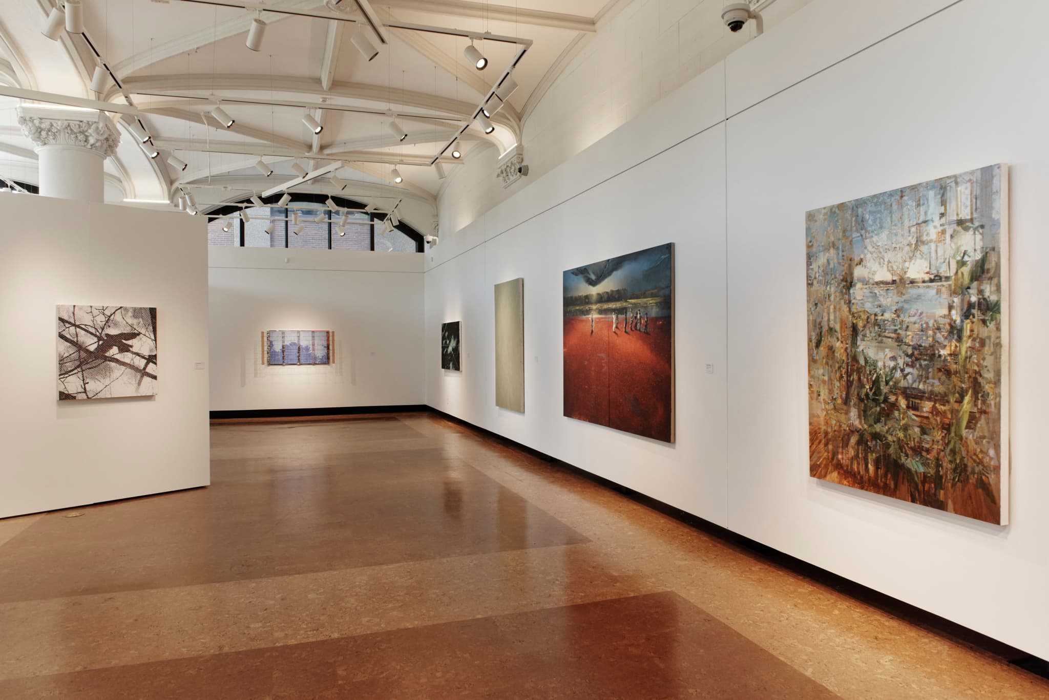 Depending on how you situate yourself amidst the gallery’s three floating walls and spacious footprint, you can nestle yourself with single works or take in broad slices of the complete show. Both are rewarding, as Murphy has organized the exhibition to amplify the ways in which each work both relates to and contrasts with the others, rather than hanging by chronology, artist, or strict subject matter. Stand back from Matt Huffford’s Storybook, for example, and you’ll see his emeralds and marigolds picked up in Stephanie Pierce’s Cosmos on the wall just beyond. In both floral scenes, the tonal and thematic harmonies are immediately apparent, while the variations in method and material underscore each painter’s artistic priorities.