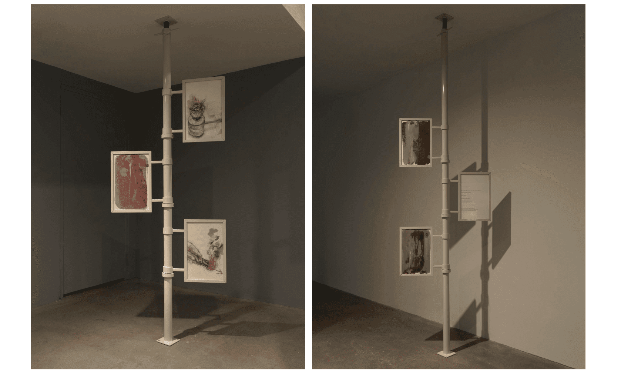 “List Projects 28” presents two expanded cinema pieces as well as thirty-two mixed-media drawings that are installed flag-like across five floor-to-ceiling poles. The two sets of drawings—half belong to Shin and half to Friedman-Pappas—are framed back-to-back in a display structure that is evocative of didactic signage, and can be easily repositioned by viewers.