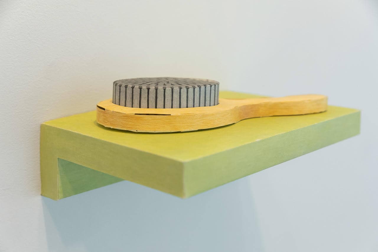Samuel Alexander Forest, Hairbrush, 2022. Graphite and colored pencil on paper. 4.5 × 10.5 × 6.5 inches. Installation view, “What’s New In Still Life, Portrait, and Landscape,” LaiSun Keane, Boston. Courtesy of LaiSun Keane. Photo by Dan Watkins.
