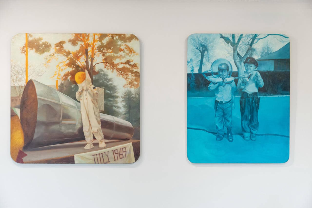 (left) Meghan Murray, PRESIDENT NIXON’S OPPORTUNITY TO BRIDGE ‘THE LUNAR GAP’ (DEC. 1, 1969), 2022. Oil on linen over panel. 48 x 48 inches. (right) Meghan Murray, ATOM ROCKETS DECLARED READY FOR COMBAT USE (DEC. 21, 1952), 2022. Oil on linen over panel. 48 x 39 inches. Installation view, “What’s New In Still Life, Portrait, and Landscape,” LaiSun Keane, Boston. Courtesy of LaiSun Keane. Photo by Dan Watkins.