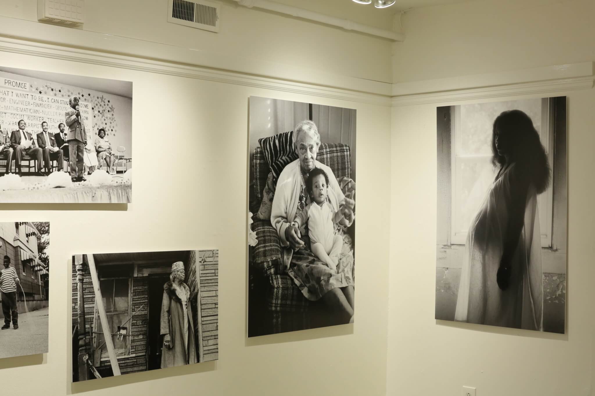 This intergenerational binding is conveyed in Wall of Promise. In this 20″ x 30″ photograph, seven adults sit on a stage in a New York City public school, the men in suits adorned with boutonnières on the left and the women in dresses and pearls on the right, before a large block of text—the “Wall of Promise”—behind them. The text, written in first person, pledges that one can study and become anything that they want to be, listing careers from chancellor, doctor, engineer, to lawyer, mathematician, radiologist, and social worker. A lone little boy stands tall downstage with a large microphone in hand, seemingly making a declaration to the audience. The photograph signals the dedication of Black elders to encouraging and supporting Black futures. This theme is central to photographs created by Miller, who affirms that “the history of hundreds of years of enslavement, Jim Crow, and existing racist systems, [that] have not thwarted our efforts to flourish magnificently.”