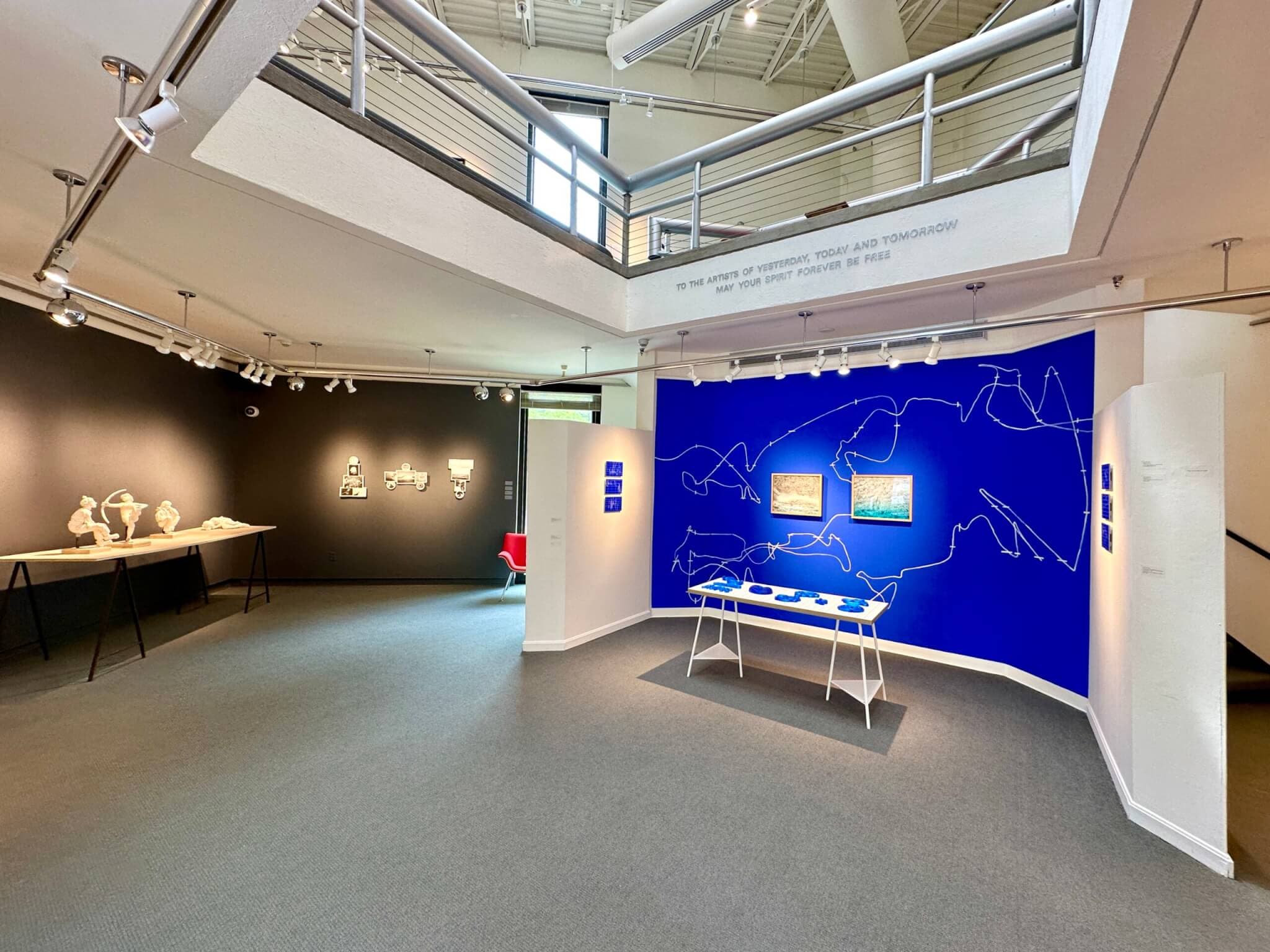 Installation view featuring work by Kathryn McElearney (left) and Justin Levesque (right), “Circle of the Sun,” at the art gallery of the University of New England in Portland, 2025. Photo courtesy of UNE Art Gallery.