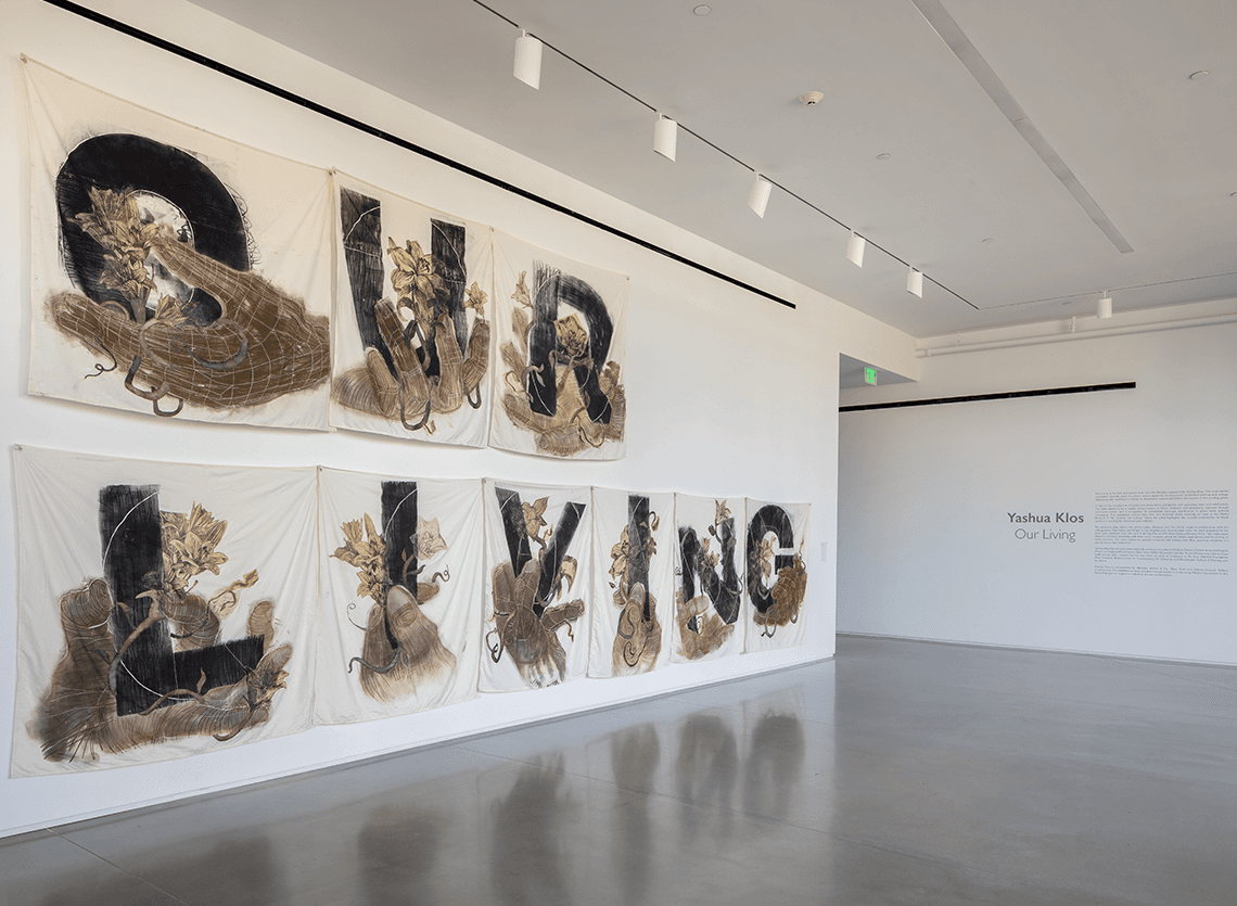 Yashua Klos, Our Living, 2022. Woodblock and rice paper on muslin. Photo by David Clough.