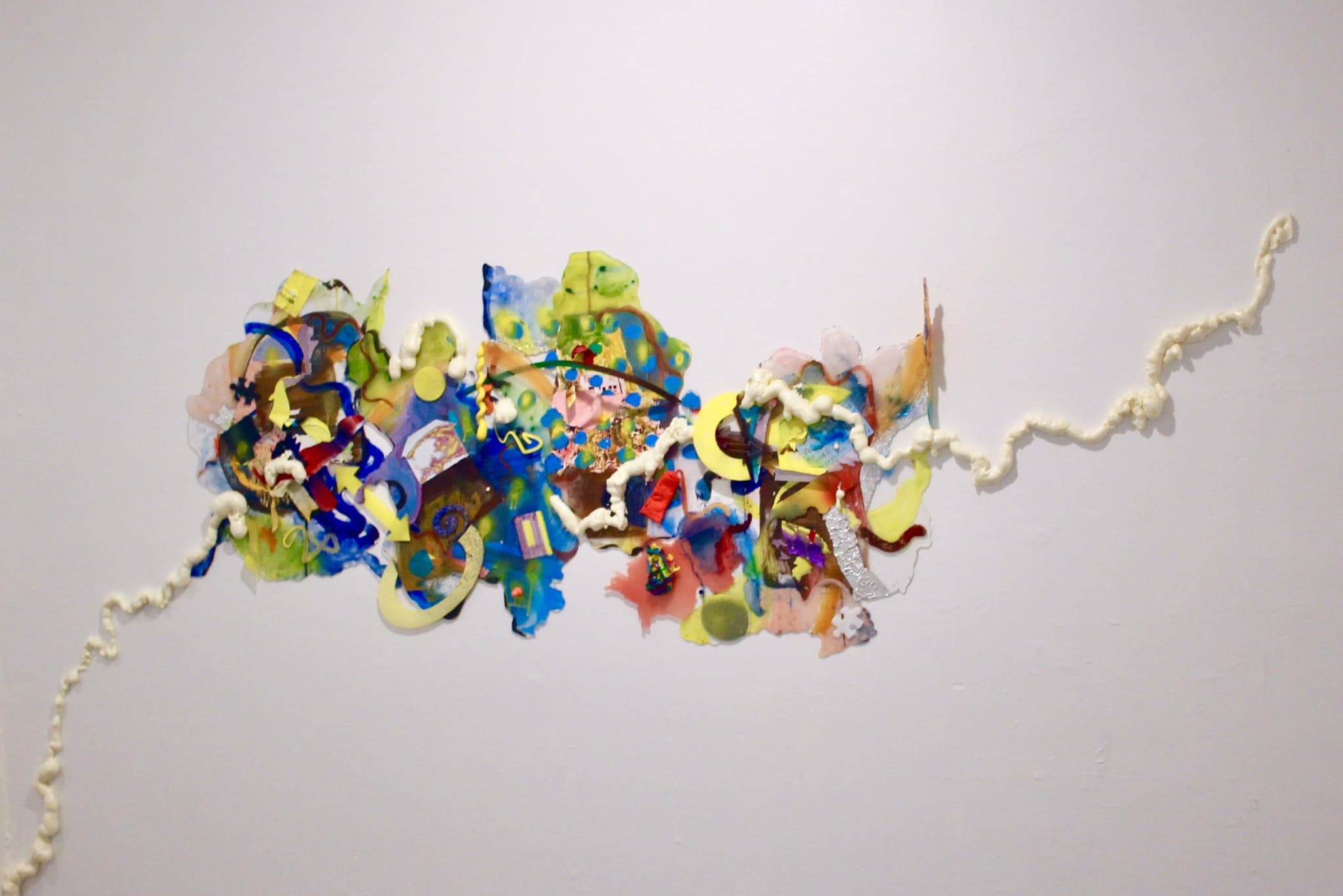 In her first solo exhibition, “Wandering Be-ing” at Distillery Gallery, Sunny Moxin Chen presents paintings, textile works, site-specific installations, and sculptural assemblages that reveal a state of impermanence. For Chen, who has lived in Moscow, Beijing, and San Jose, and recently graduated from Boston University’s MFA program, home is a movable point. Moving this point leaves a trail of residue, a leaking impression of self that exchanges, absorbs, and expands when drifting and discovering one’s position in the world. Chen conveys this nomadic path and its ontological ripples through gesture and material. Paint layers into three-dimensional globs that meander through the space, like footprints along a journey. The gallery itself becomes its own kind of border-less map that captures the artist’s transient presence.