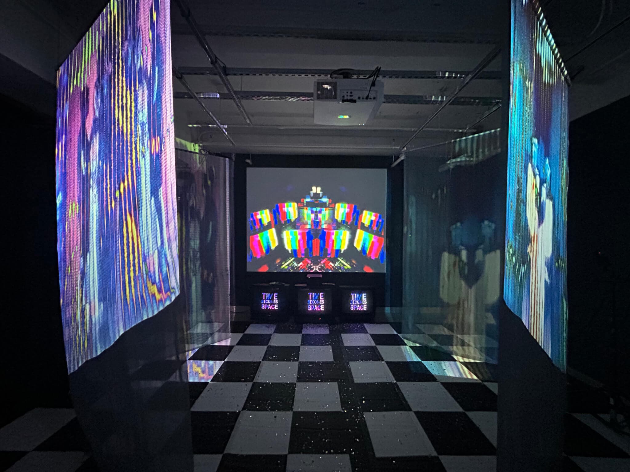 VHF Studio, Narcissus Looks Back, and They Love You, 2025. Installation view, “Echoes of the Heart: New England Media Art Biennial,” Media Art Gallery, Emerson Contemporary, 2025. Courtesy of Emerson Contemporary.