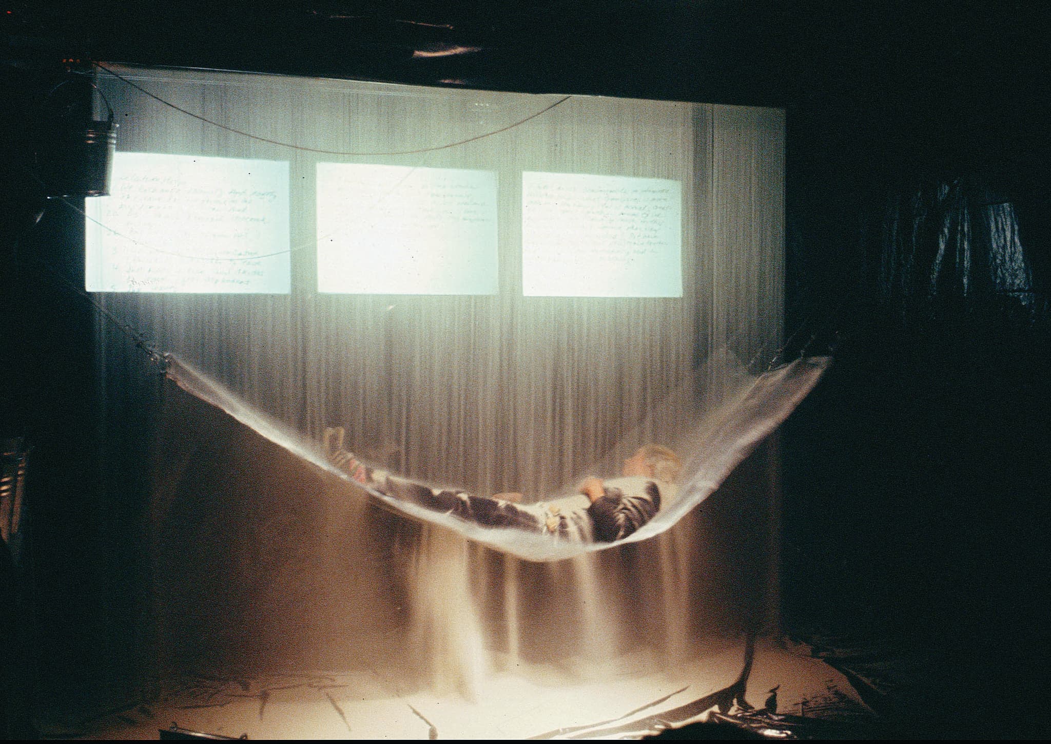pastpresentfuturetense…ppft, 1977. Performance still: sand curtain as it releases from the ceiling. Photo courtesy of the artist and Mary Boone Gallery.