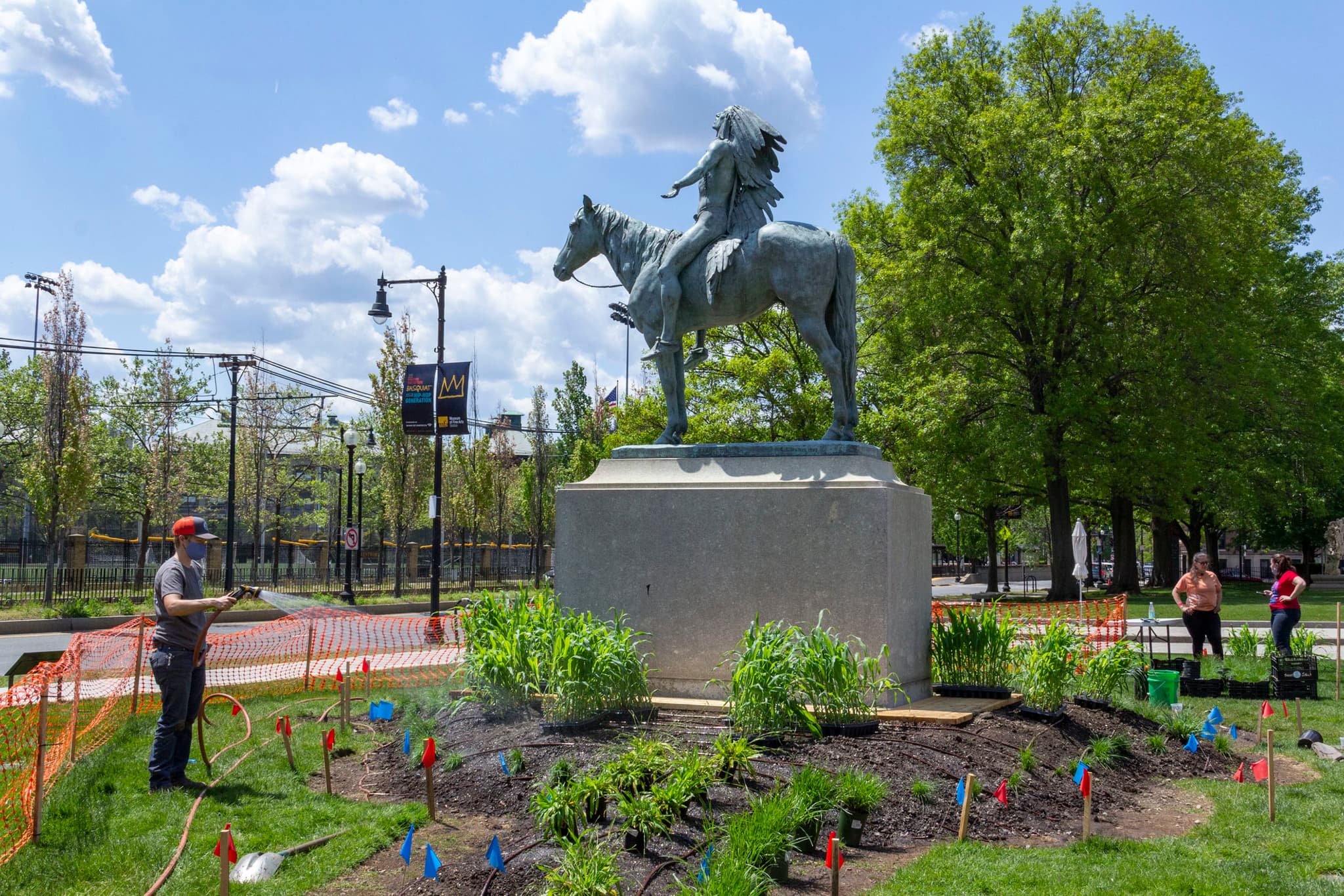 Elizabeth James-Perry and her team planted a Three Sisters garden around Cyrus Dallin’s Appeal to the Great Spirit for Raven Reshapes Boston: A Native Corn Garden. Photo © Museum of Fine Arts, Boston.