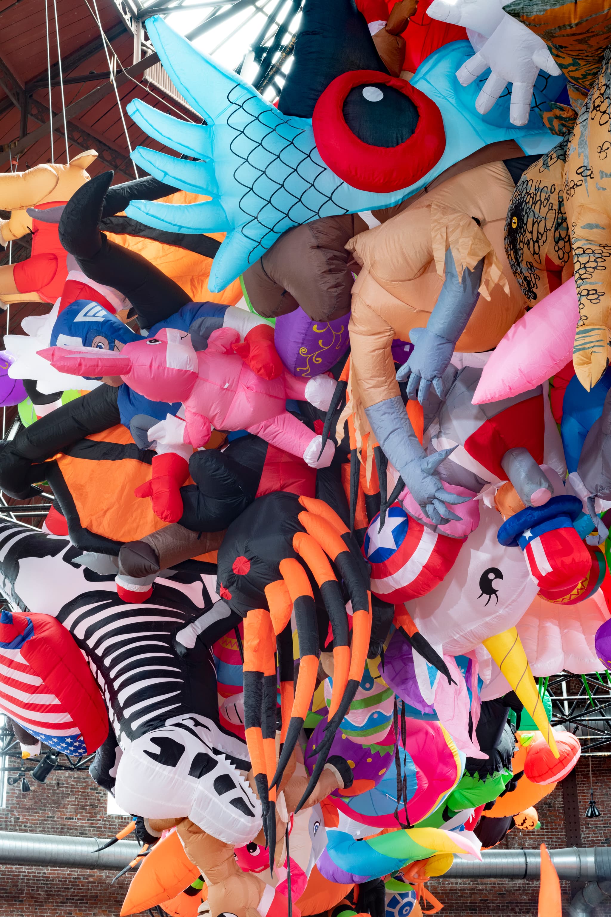 Nick Cave: For the last decade my work has really been very much focused on looking at gun violence within our culture. I sort of came to this conclusion with that work, and I wanted to then go forward with the work being about happiness—or what we think that is. So then I was sort of questioning, what does that mean? What does that look like? It led me to think about the holidays. We go into the holidays with great intentions, and yet for a lot of people it becomes this destruction. It just falls apart. But how do we still find ways to find the positive, to hold it together? So “Augment” came out of that. I decided to look at all the holiday inflatables as a source material. I wanted to take all of those, cut them up, and sew them all back together. “Augment” is sort of taking parts and pieces of something and making it greater. And so then I just made these outrageous, insane inflatables that are just crazy, exciting, and fun and interesting and disturbing and colorful.