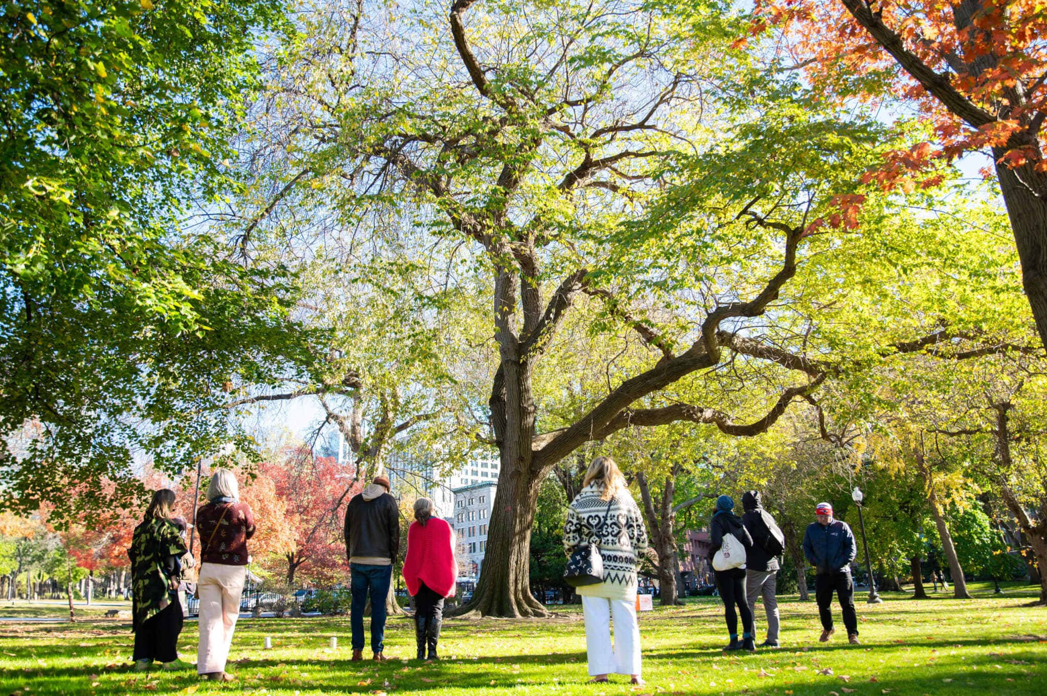 Walking tour attendees gather around one of the trees featured in “Future Monument to the Trees of the Public Garden,” November 2024. Photo by Annielly Camargo.