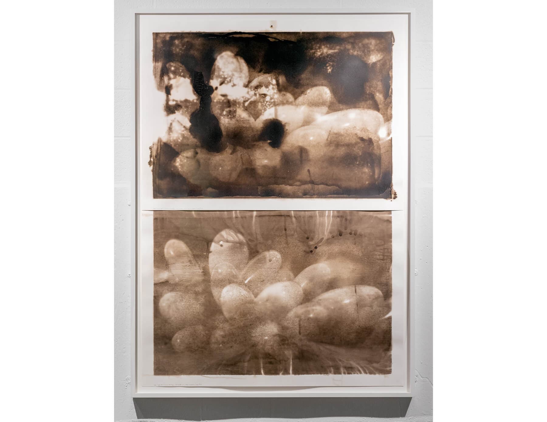 The images these live cells represent are just as potent and charged as the material used to produce them. A diptych of prints show jade carved to look like grapes, creating a sort of mise en abyme, as living organisms (bacteria) represent artificial constructions (carved jade) that represent living organisms (grapes). Elsewhere, a diptych of prints titled Jon Sleeping #1 and Jon Sleeping #2 depicts the artist’s spouse in deep sleep. Sleep is the proverbial cousin of death (is Jon dead or dormant?), but these prints teem with residue of bacterial life and are indexical of shared conjugal life. I think again of Laura Marks: “It is hard to look closely at a lover’s skin with optical vision.”