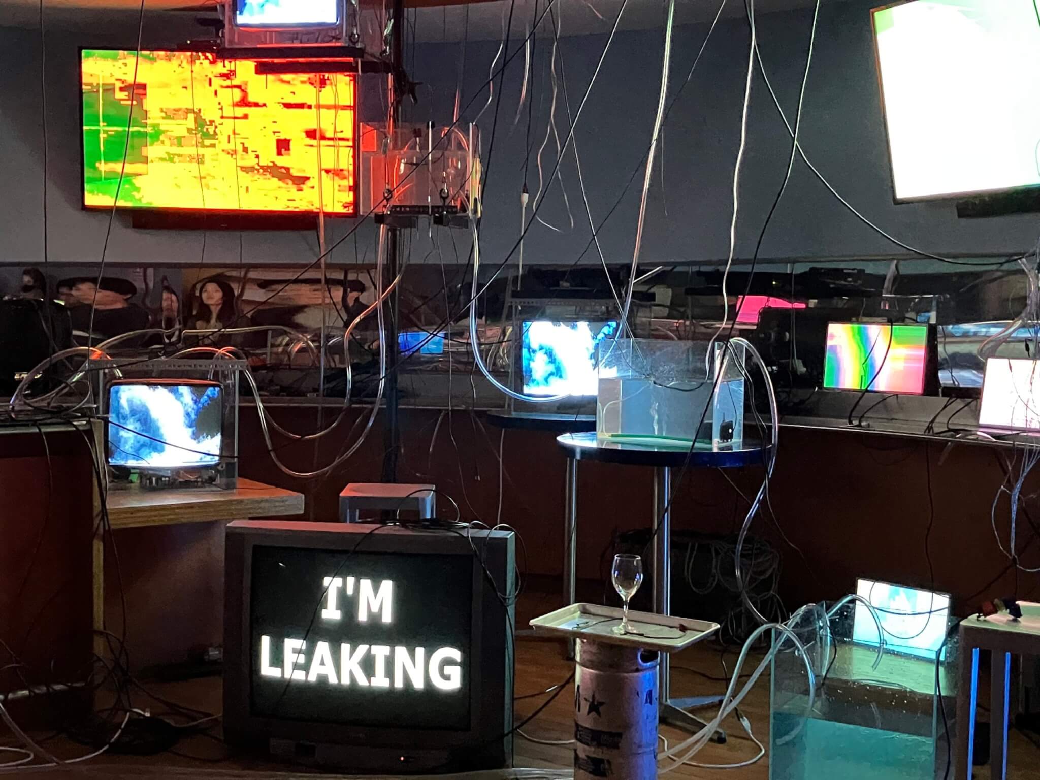Nakamura’s performance has no affiliation to any of MIT’s museums or art spaces (including the List Visual Arts Center where I happen to work), and instead follows a longstanding tradition of “hacking” across the campus. I came across an invitation to Nakamura’s performance through the artist’s Instagram (@frog_spit_simulation), where interested parties were instructed to claim their spot for one of the performances by simply placing an “X” in an open-access Google Sheet on the date of their choosing—an honor system, really. The performances can accommodate no more than a dozen people at a time, which is fitting for an event that turned out to be intimate and vulnerable, but intensely humorous. Inside the space, TVs were flickering, glass tanks gurgled while dangling from the ceiling, and a seemingly endless web of cables encircled old beer kegs. When it was time to begin, Nakamura quickly addressed the crowd and handed out bits of chopped wires before returning to the site of the former bar counter and using an old soda gun to fill up glasses of water. Moving around the space, the artist connected wires, turned dials, and pressed buttons that appeared to awaken the system. The machine—and the pub—were coming alive.