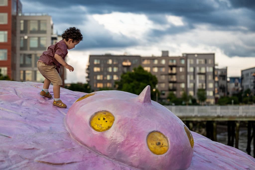 A child plays on Eli Brown’s installation Beam Me Down (2022) in LoPresti Park, East Boston. Courtesy of Now + There. Photo by Caitlin Cunningham Photography LLC.