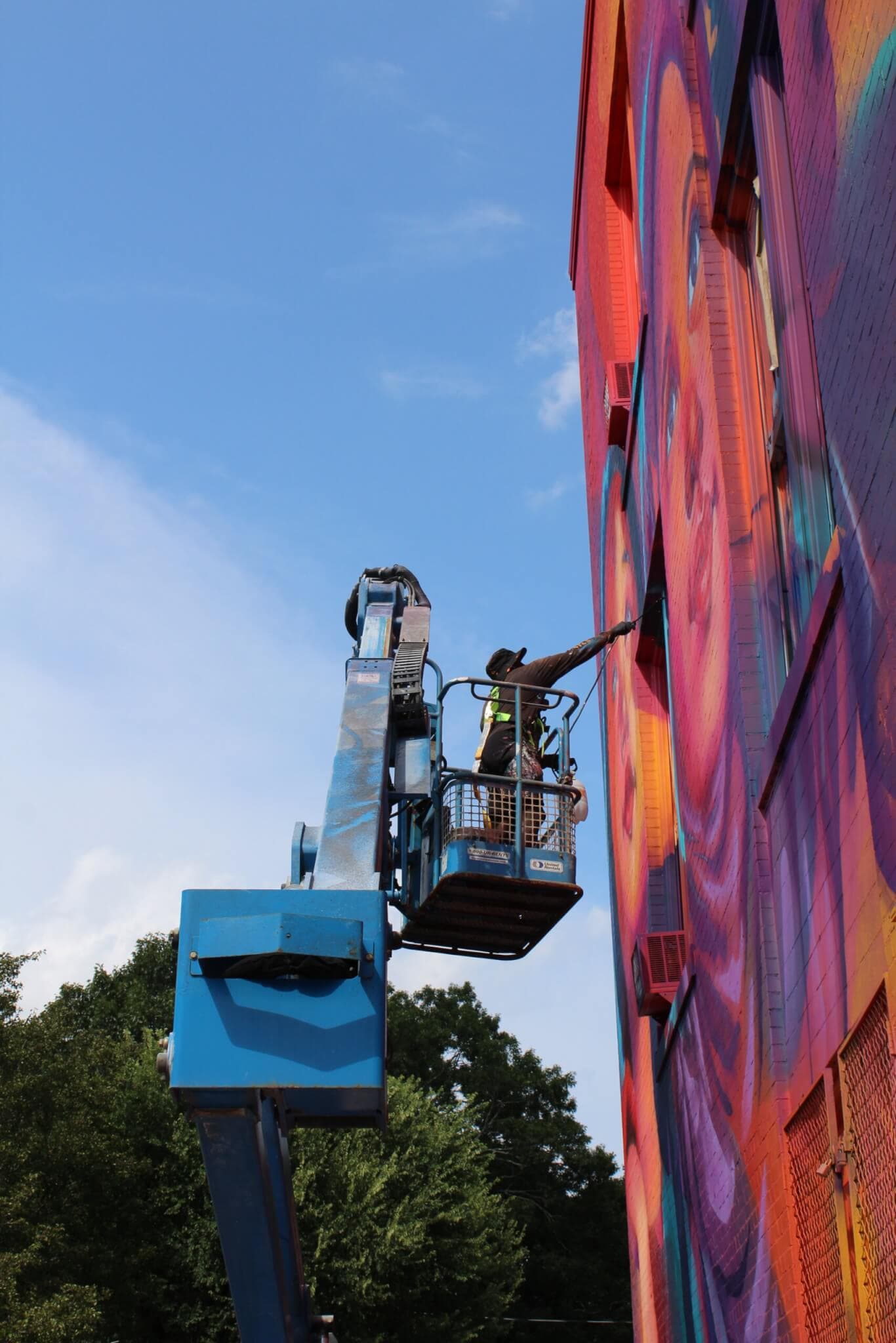 When he arrived, Detour could already tell that this could be a community that would be slow to warm to his art: “Coming to this neighborhood, I can tell there are a lot of people rooted in the community that has been here for a really long time and for a long time this has been only a brick wall. That’s what they are used to. Murals are always something that just lands on you and so having something super colorful on something that has been brick for so long is definitely shocking. Sometimes even just seeing the process of how I do things can be shocking because at times it is just colors being thrown at the wall.” But he was not intimidated by some people’s initial response. As the mural began to take shape and the figures appeared, Detour noticed that people began to react more positively.