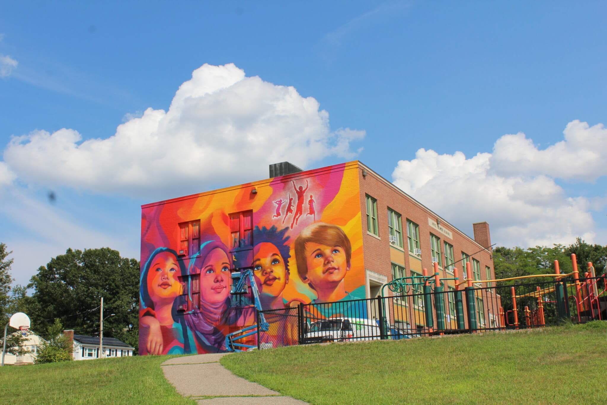 I posed the question of the mural’s place in West Roxbury to Andy Rodrigue, a neighbor I connected with in an online community group. Rodrigue is a Kilmer K-8 school parent who also lives directly across the street from the mural. “I don’t know of a place where public art doesn’t have a place. That’s kind of the point, it’s for the public. It can bring people together, inspire them, and give them a sense of belonging. I’m at a loss to say why people would feel as though these qualities don’t belong in a public schoolyard,” Rodrigue said. He also shared that, as an architect, he is especially committed to this point of view. “We strive to find ways to ‘activate’ spaces, to find ways to gather, interact, build relationships, and adapt those spaces to fit a user’s individual and social needs. Public art works in the same way.”