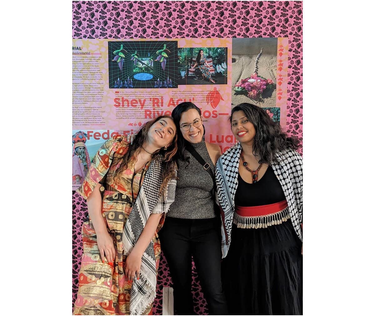 Artists Feda Eid, Shey ‘Rí Acu’ Rivera Ríos, and Luana Morales at the opening of “Everything Living Fights Back” at Aunty’s House on May 31, 2024. Photo courtesy of the artists.