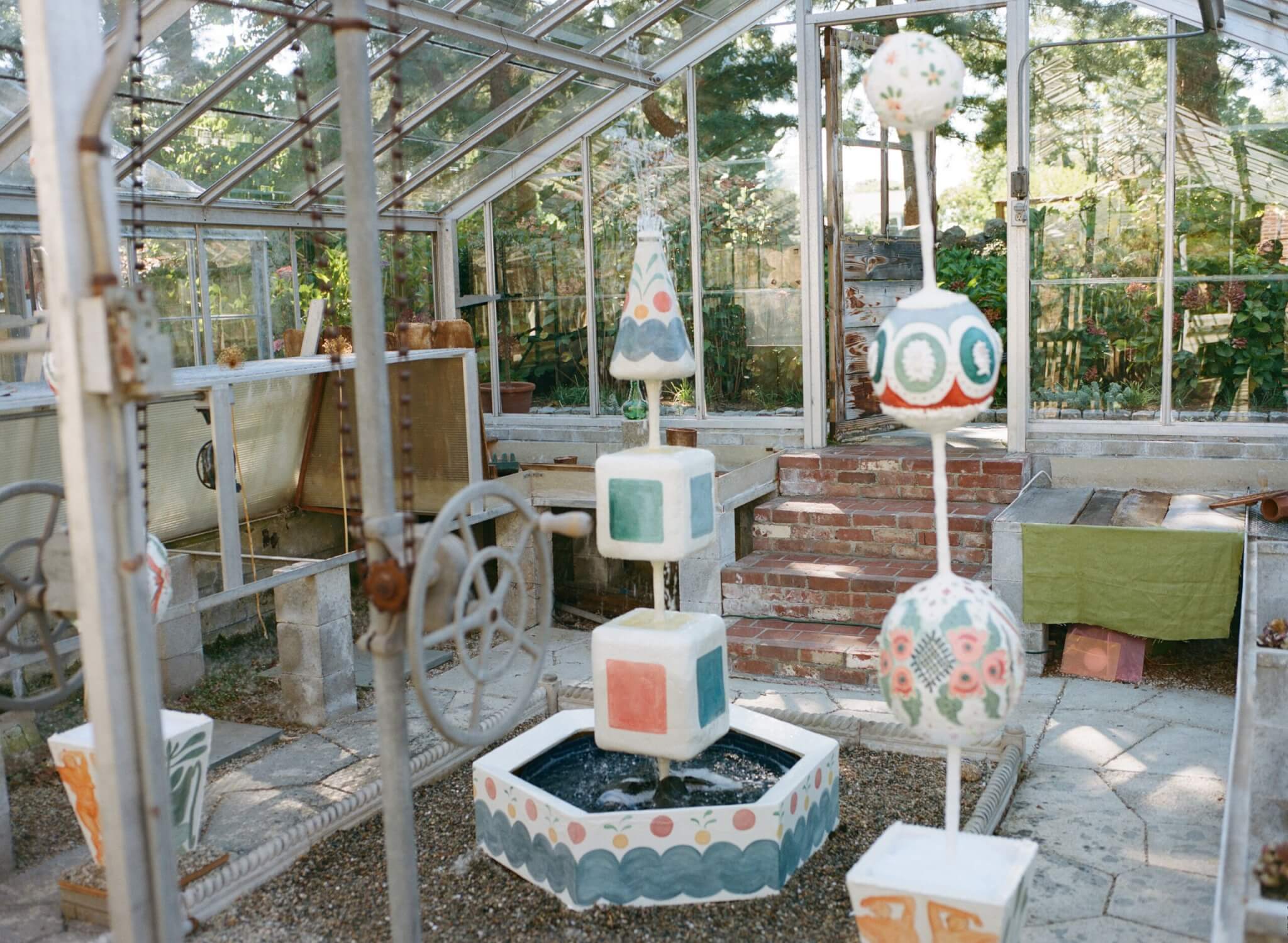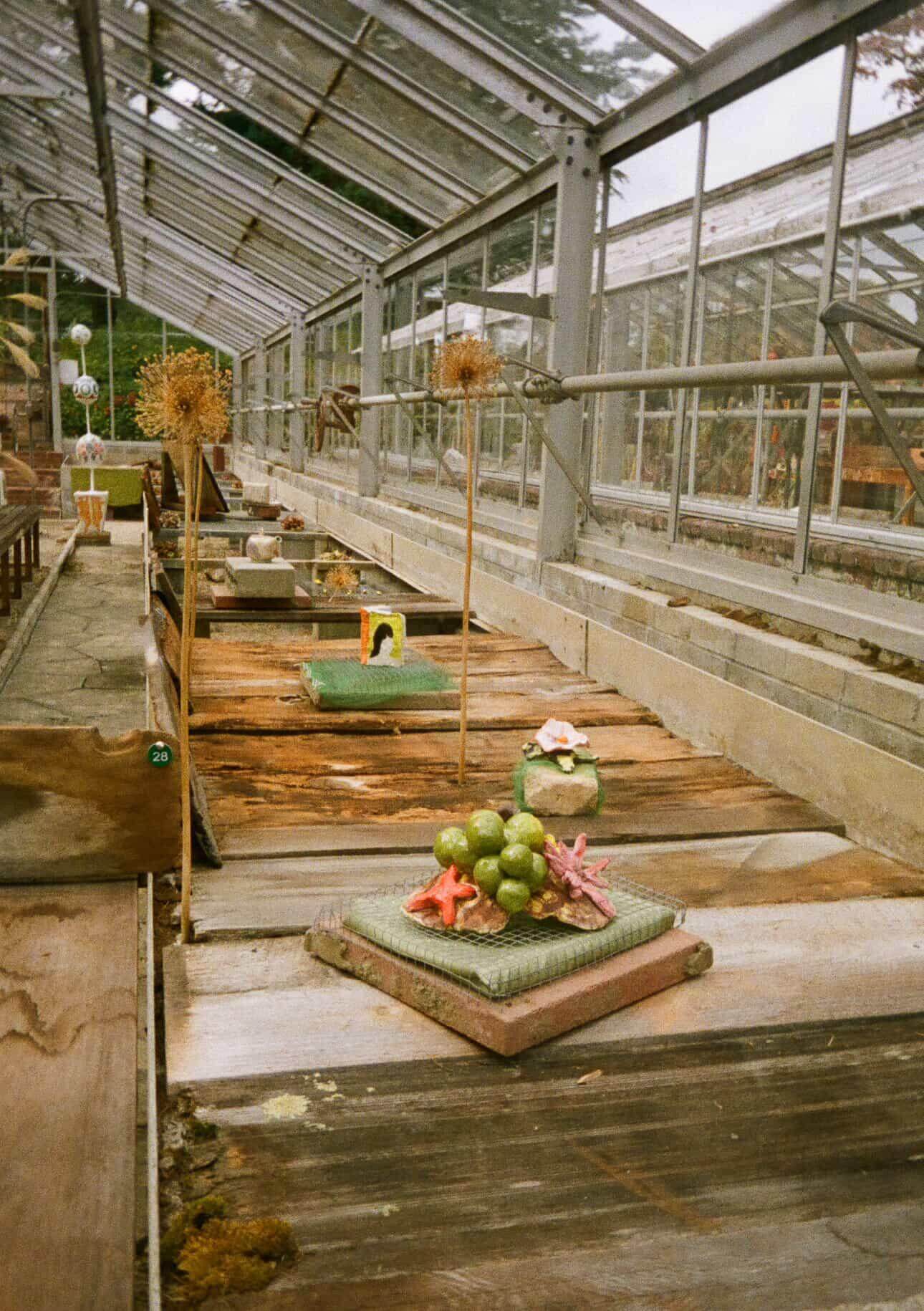 MP: It was my first time doing an open call. I put the call out on the newsletter Words of Mouth, and that really helped to spread it wide and let people know about it who would otherwise have no idea. In the call, I tried to be really clear that it may rain on your piece, that it will be over 100 degrees—all these different factors that limited who applied. So a lot of people who applied were ceramicists, because that work can withstand the conditions. And some other people applied anyway and were willing to take the chance. From there, it was a super intuitive process. I’m not a trained curator; I’m an artist. But I’ve done a lot of curation and love to put pieces together. So I chose pieces based on knowing the theme that I was going for, which is the slow, the handmade, seeing the messiness, the human trace, and also things that I knew would look good in these greenhouses. It’s all viewed from the exterior because the greenhouses are defunct, and for legal reasons, they didn’t really want the public going through. So it’s sort of like a window gallery, like window shopping. Something I’ve always been interested in is window design for big stores, which I’ve never gotten a chance to do. This was a really fun opportunity to pretend I was window dressing an Hermès shop—though obviously not at all because it was very DIY and chaotic, but in a beautiful way.