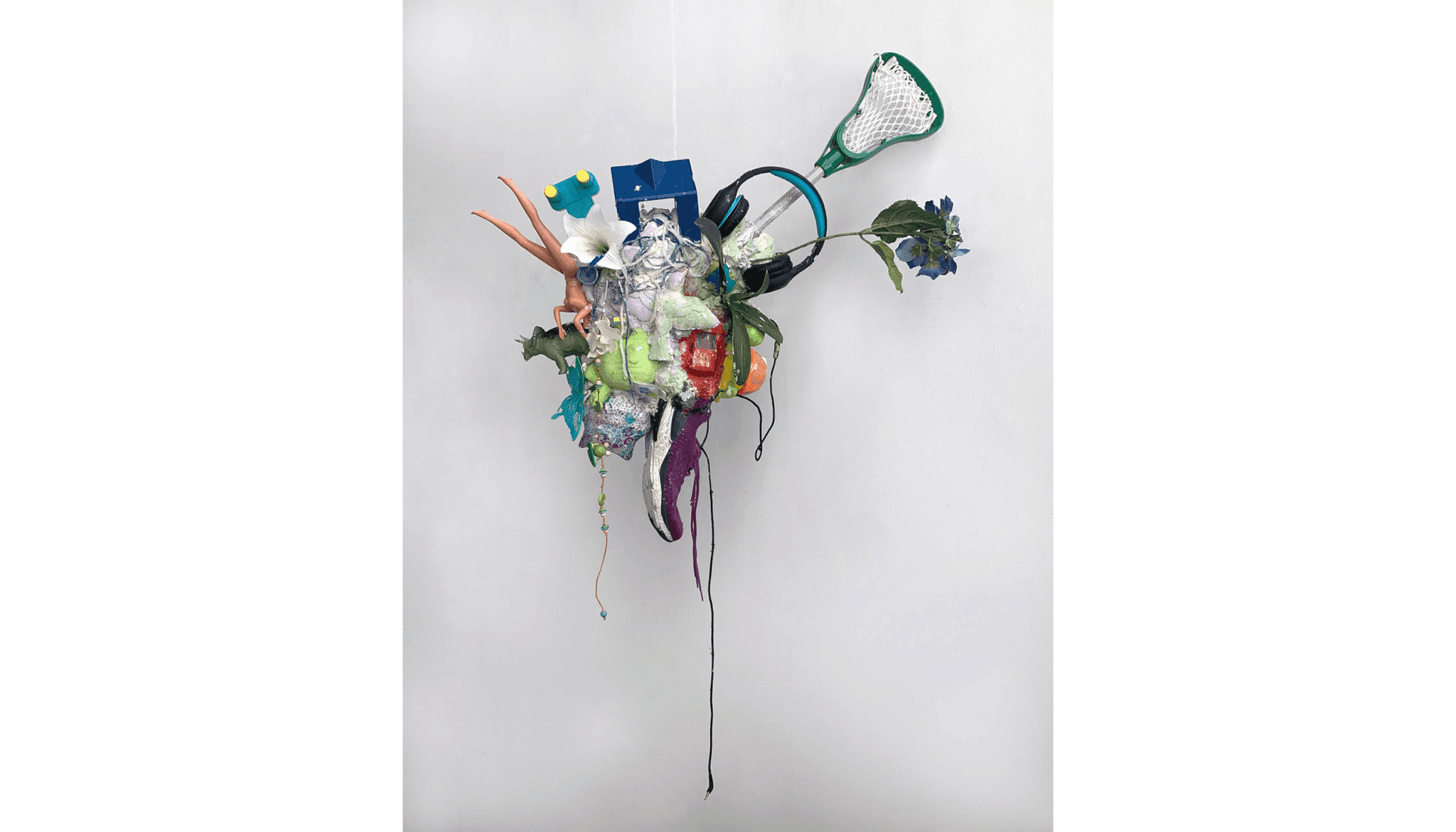 Birdsong II, like Brent’s other works, combines both natural elements and collected items. It includes a lacrosse stick, a sneaker, headphones, a dinosaur toy, and an upside-down, headless Barbie. These items are combined with leaves, fake flowers, and vines. The items positioned toward the front of the sculpture are covered in acrylic, making them almost indecipherable, while the items positioned in the back protrude, calling extra attention from the viewer, suggesting that addressing overconsumption is “on the back burner” collectively, despite the immediate threat of environmental destruction. The positioning of the Barbie highlights the stress of the climate crisis, especially on mothers—it is turning our worlds upside down. The lacrosse stick and sneaker play an interesting role in this sculpture, reexamining what “play” means for a mother. How can we be playful with our children in the midst of such a grave threat?