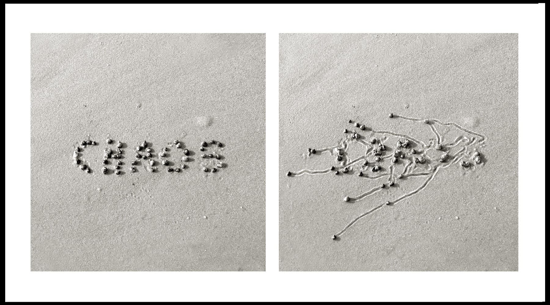 Ranalli arranges the snails, for the most part, in geometric formations: a triangle, a spiral, an infinity symbol, a line. (Sometimes he adds another object, like kelp or a stone, to the configuration—perhaps merely for aesthetic purposes, or perhaps to influence the snails’ paths.) In one image, aptly titled Chaos Theory #2, the snails spell out the word “CHAOS” in capital letters. In the corresponding “after” photograph, the letters dissolve as the snails embark on their own wayward journeys, some heading toward the top of the image’s frame, others toward the bottom, a few stragglers lingering behind in their original spots. “CHAOS” has dissolved into chaos; order has given way to disorder. Or has it?  The snails’ tracks might appear random at first glance, but a longer perusal reveals a certain pattern in their movements. None of the snails in Chaos Theory, for example, head toward the right side of the frame. And in the nearby Snail Drawing: Stone #3, which features a ring of snails around a rock, nearly all of the snails have turned back to the rock by the time the second photograph has been taken. If “Snail Drawings” is about the futility of human attempts to structure the world, it is also about the world’s inherent structure.
