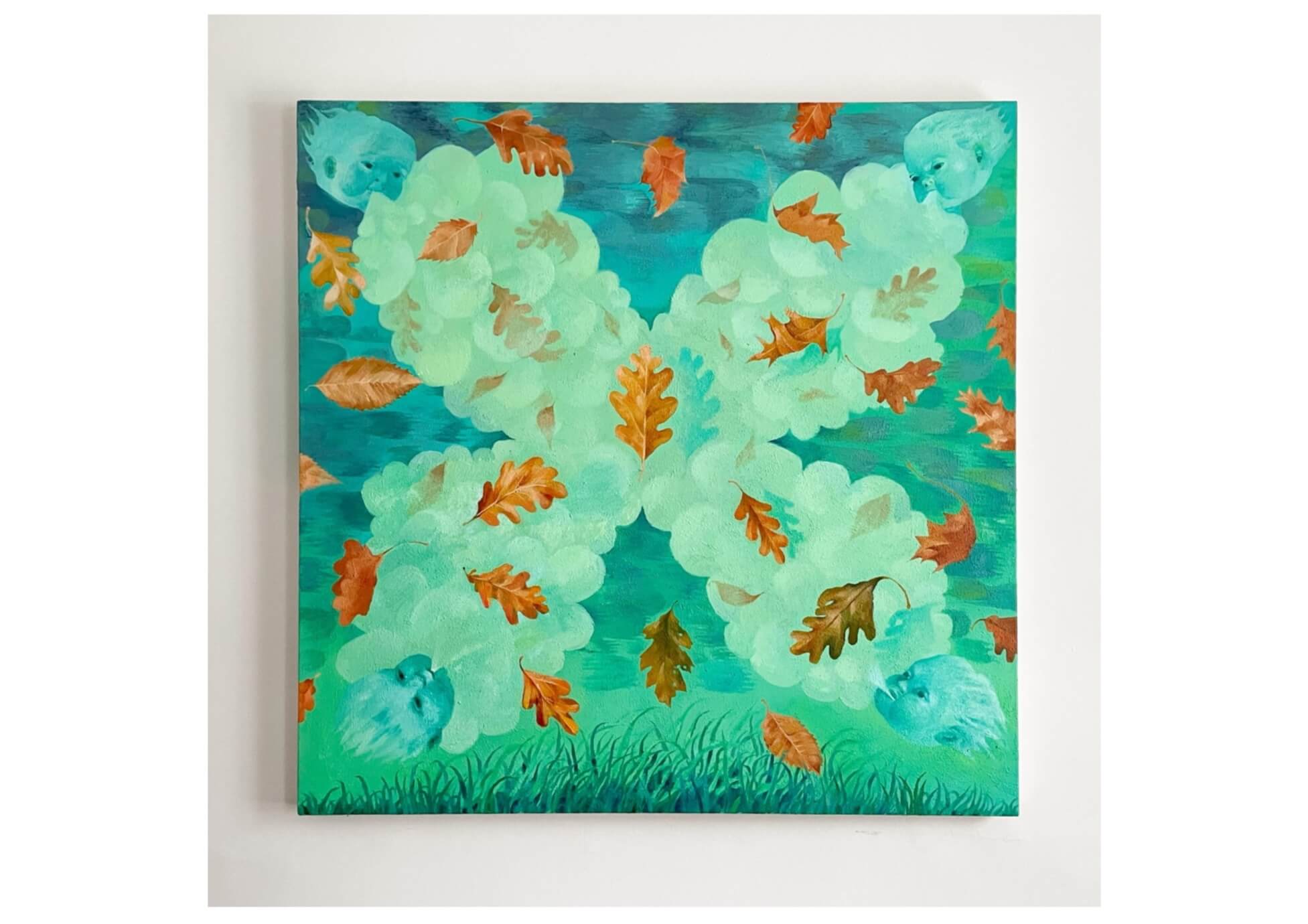 Rust’s work also creates a distortion of perspectives and this world. For instance, Wind (2024) brings something unnatural into the natural world. The painting, made of acrylic, oil, and sand shows four winds coming from the mouths of cherubs in each corner of the canvas. Leaves blow in chaos, with a singular centered leaf unmoving, as it is equally impacted by all four winds. These elements are set against a neon green background, creating a sense that the scene is not quite of this world. There is something unsettling about the present moment, as past violence and its effects permeate the artwork.