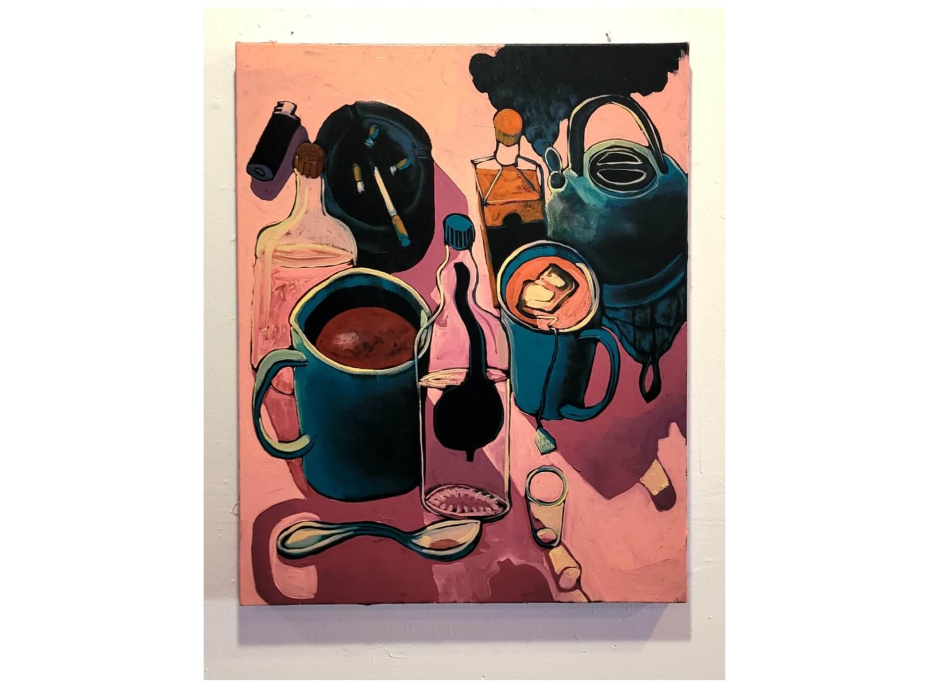The bright colors, combined with bold lines, large shapes, and dramatic shadows create a striking presence and surreal quality to the work—perhaps as if they exist within a dream. Adding to this effect is the warped perspectives of the paintings. Objects right next to each other are intentionally painted at different angles, leaving the viewer with the disorienting sensation of not knowing where we exist in the space. It’s entirely possible that the viewer is not supposed to be in the space at all, merely peering in at these mundane, but evocative moments.