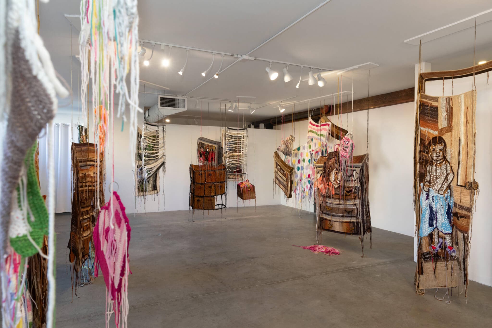 The past and present were woven together once again as I walked into LaiSun Keane and was transported to a crocheted recreation of artist Baylee Schmitt’s childhood bedroom. The exhibition, “we settle into corners with the dust and mites,” explores Schmitt’s complex relationship with her twin sister through depicting the bedroom the two once shared, crocheted from Schmitt’s memory. I felt I was intruding on an intimate space in the small gallery, as I walked between childhood beds, dressers, windows, doors, and wicker drawers—all of which hung suspended from the ceiling.