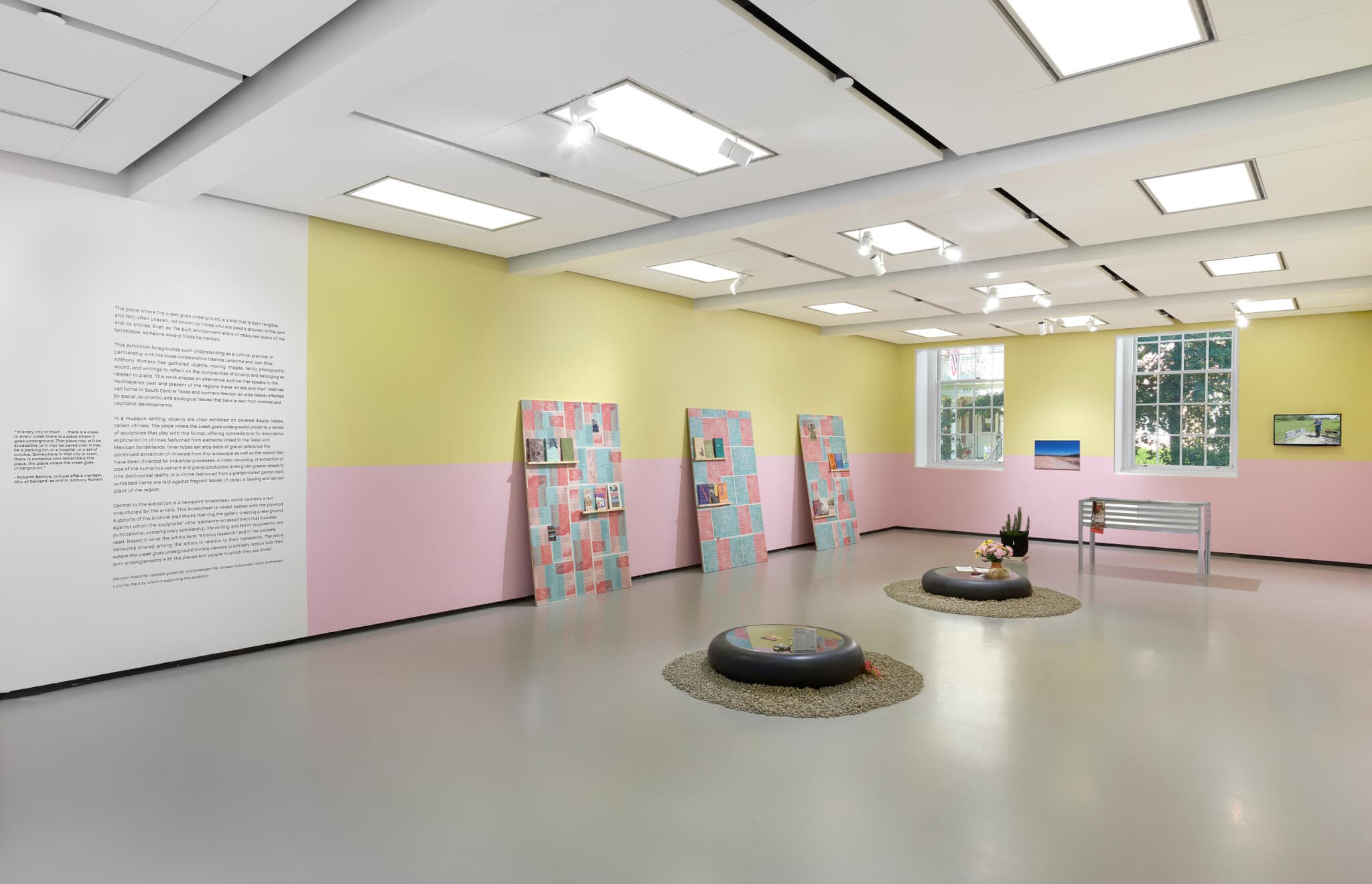 Deanna Ledezma, Josh Rios, and Anthony Romero—together known as the Place as Practice Research Collective—are just as concerned with what’s hidden as they are with what’s visible. In their exhibition at the Harvard Radcliffe Institute, “The place where the creek goes underground,” the trio make a tribute to sites, histories, archives, and points of connection that are often unnamed, but are deeply felt by those attuned to their presence. As Roberto Bedoya, the cultural affairs manager for the City of Oakland, explained to Romero, “In every city or town . . . there is a creek. In every creek, there is a place where it goes underground. That place may still be accessible, or it may be paved over. It may be a parking lot, or a hospital, or a set of condos. Somewhere in that city or town, there is someone who remembers this place, the place where the creek goes underground.”