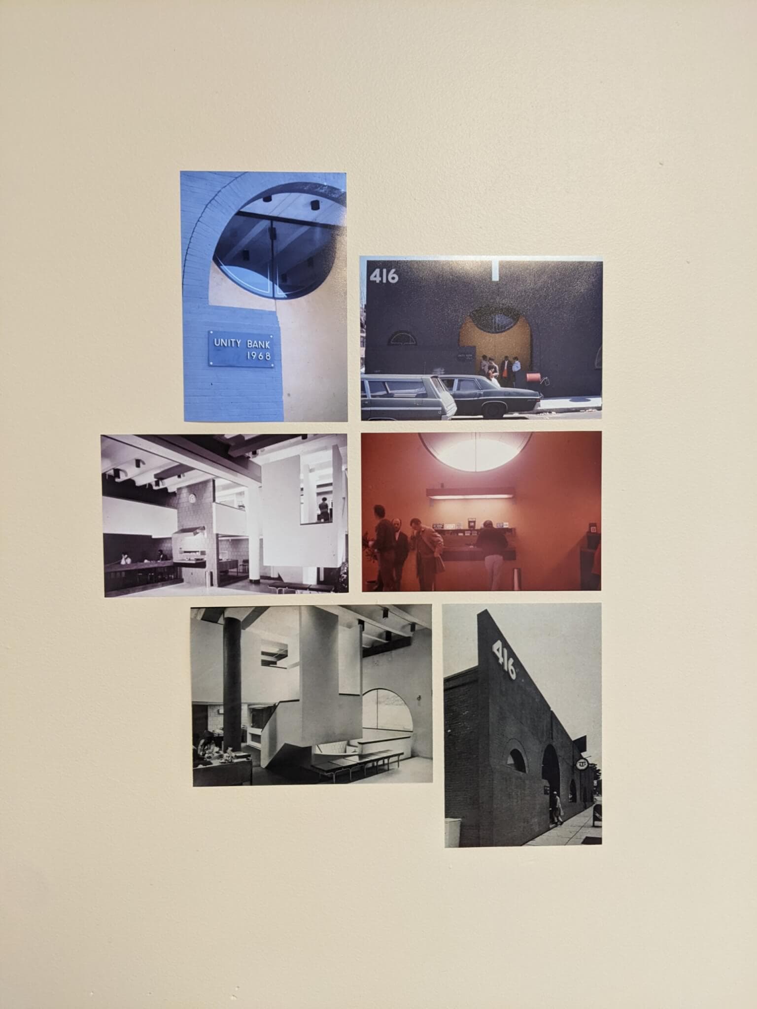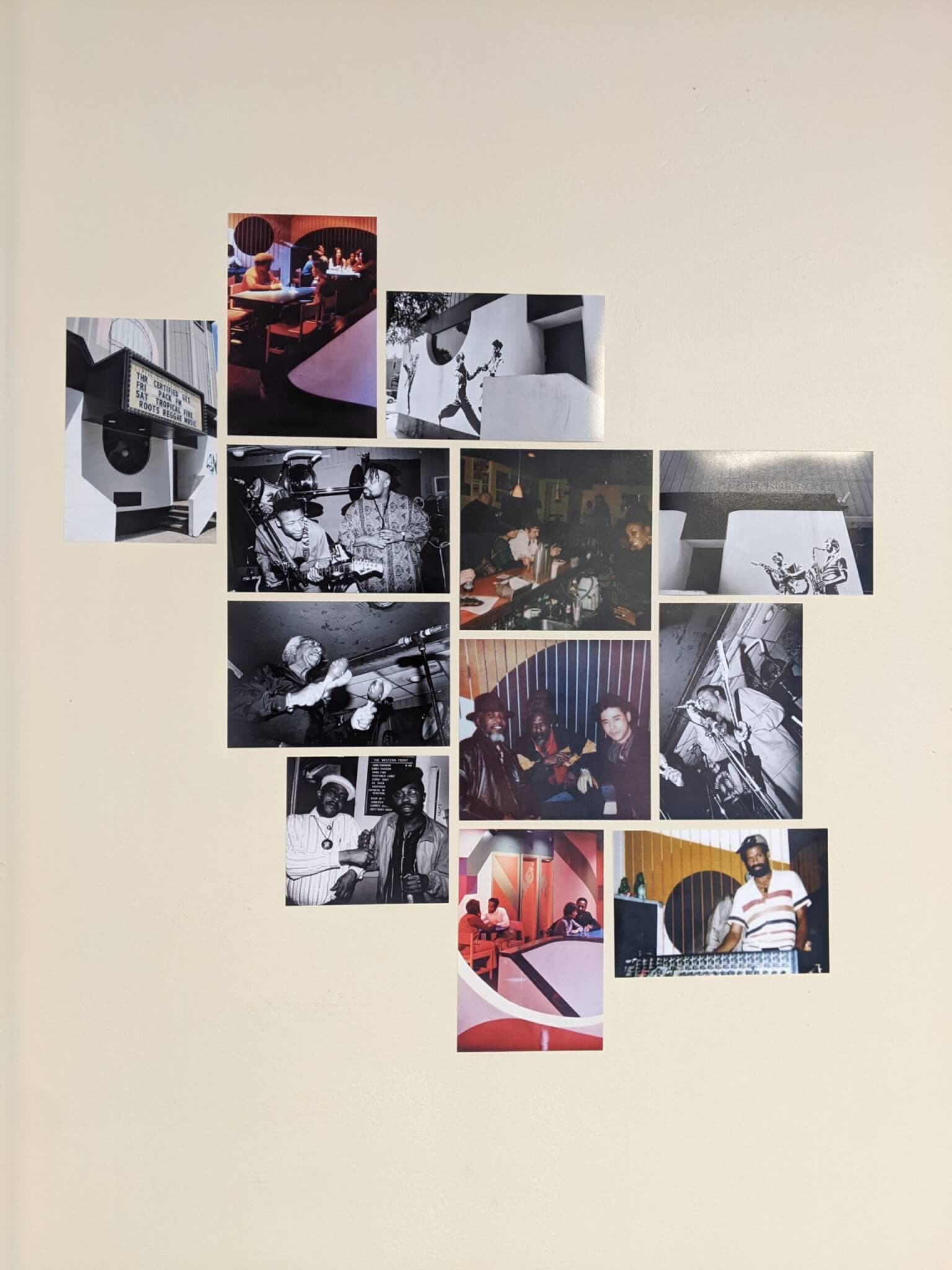 On a window and adjacent wall, snapshot photos fill the “Social Infrastructure” section, highlighting Stull & Lee design projects like Unity Bank, a Roxbury commercial bank and community space co-founded in 1968 by civil rights activists and businessmen Marvin Gilmore and John T. Hayden to combat the financial ramifications of local redlining, and the Western Front in Cambridge, Gilmore’s popular nightclub and reggae-jazz bar that operated for forty-six years.