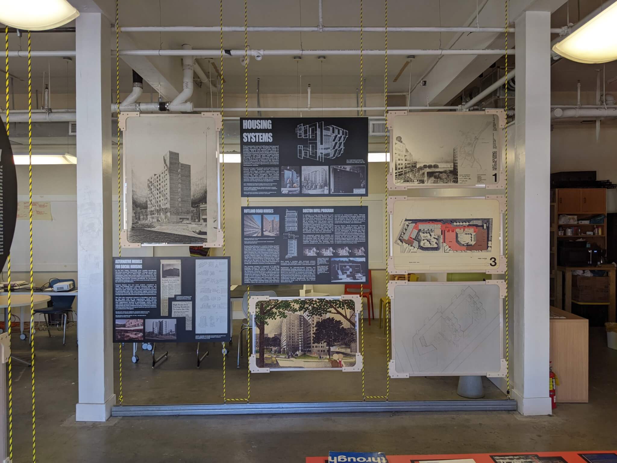The designs for many of those projects are now on display in the exhibition “Stull & Lee: Black Architecture Vision for an Infrastructural City,” which is on view at YouthBuild Boston’s Designery in lower Roxbury. The gallery is set in the nonprofit’s open workspace where aspiring youth architects are mentored through one of the organization’s many programs. Curated by local architects Gabriel Cira and James Heard and Boston-based designer Julian Phillips, with funding from the Graham Foundation, the exhibit is an homage to the groundbreaking work of one of Boston’s first Black-owned architecture firms, which reimagined the infrastructure of the city with a focus on “community-driven design.” The multimedia exhibition features slide decks, memos, pencil sketches, newspaper clippings, elevation drawings, bookmarked magazines, and other forms and displays of the architects’ work and impact. Hanging on walls or attached to black-and-yellow ropes mounted from floor to ceiling, these elements are accompanied by descriptive plaques that resemble filing cards the firm once used.